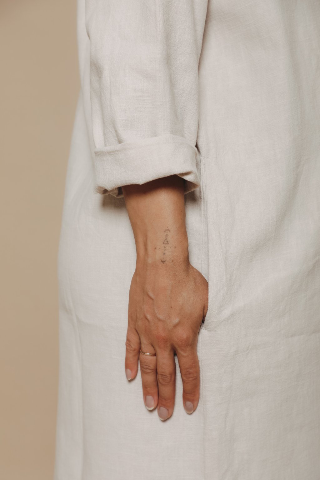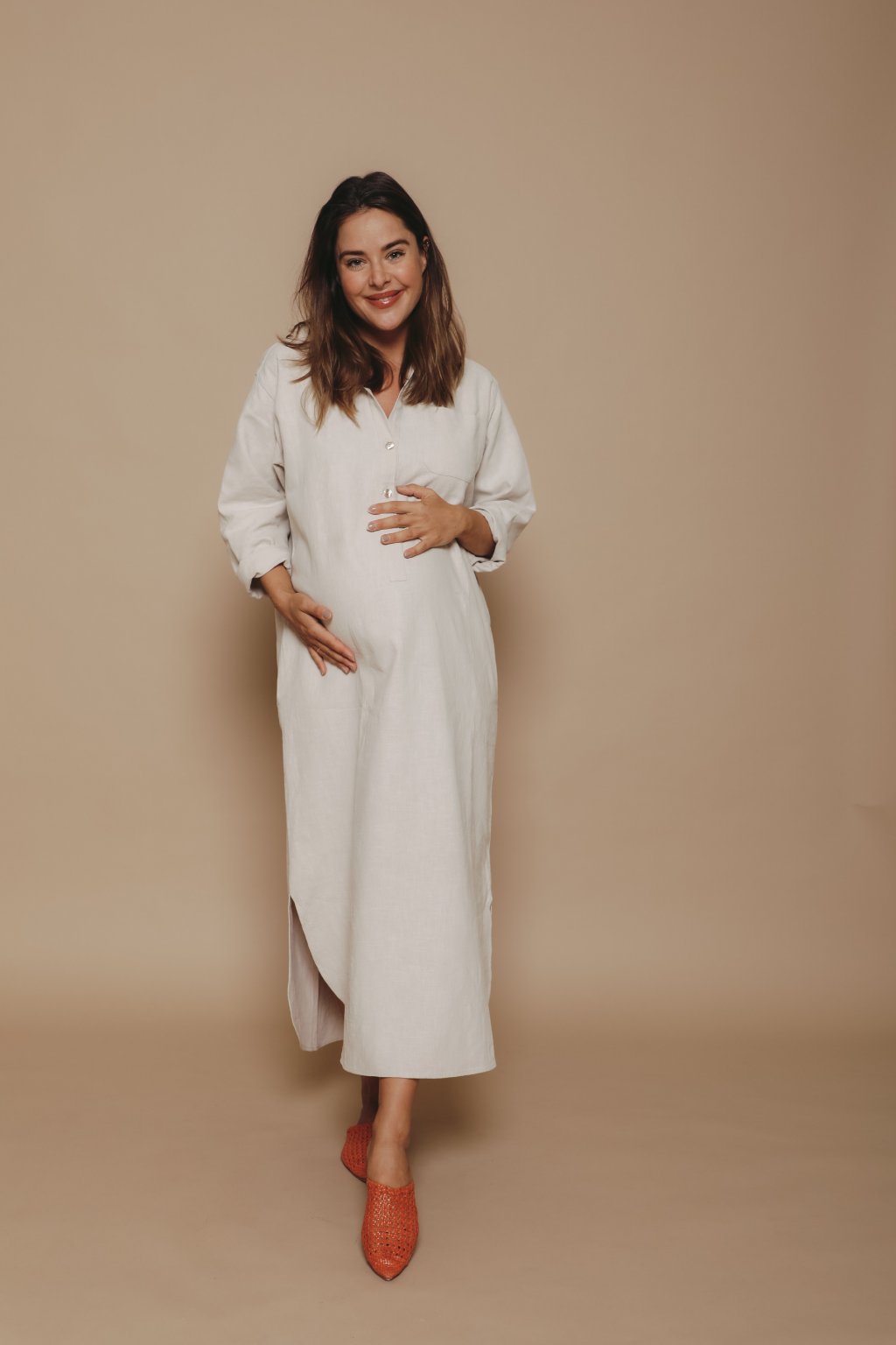 Šaty v krásné krémové barvě pevného lnu budete milovat od jara do podzimu. Volný avšak krásně sedící střih mohou využít také budoucí maminky pro pohodlí svého rostoucího bříška. V opačné variantě je krásně vypadající také kožený pásek, který postavě dodá siluetu. S letními sandálky, či s punčochami a džínovou bundou. Pokud plánujete zaplnit svůj šatník minimalisticky, jsou tyto šaty skvělou volbou.